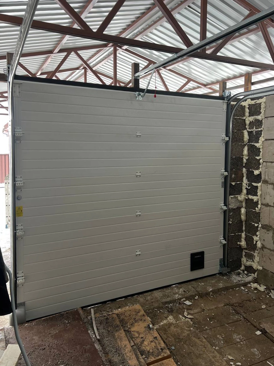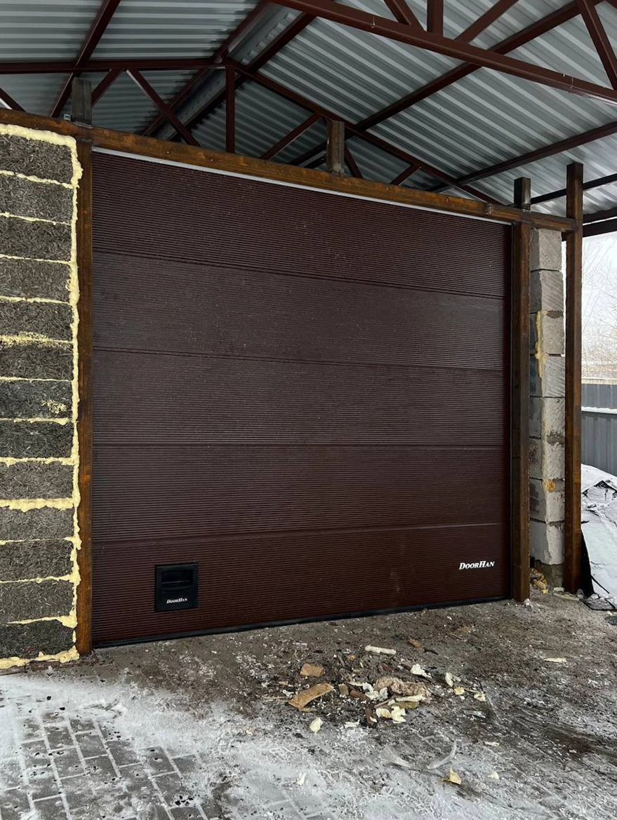 Секционные гаражные ворота с электроприводом. Цвет RAL 8017, дизайн «Волна». Структура "Под дерево".