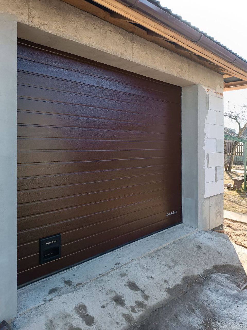 Секционные гаражные ворота с верёвочным ручным приводом. Высокий наклонный подъёмом, повторяющий геометрию ската крыши. Цвет RAL 8017, дизайн «Доска». Структура "Под дерево". Отдельностоящая дверь по дизайну ворот.