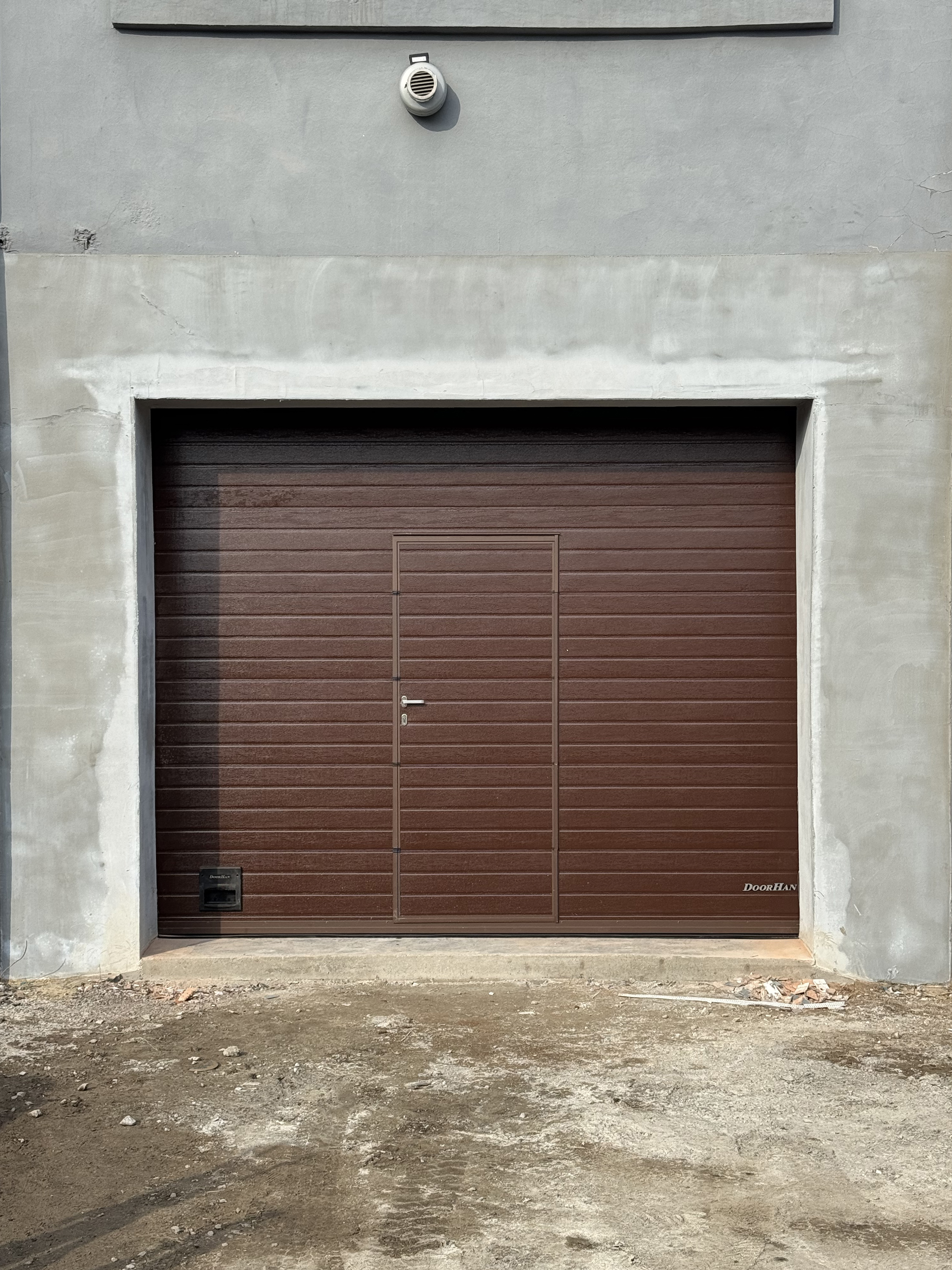 Cекционные промышленные ворота с калиткой. Оборудованы ручным цепным приводом. Цвет RAL 8017, дизайн «Доска». Профиль калитки в цвете «Коричневый».