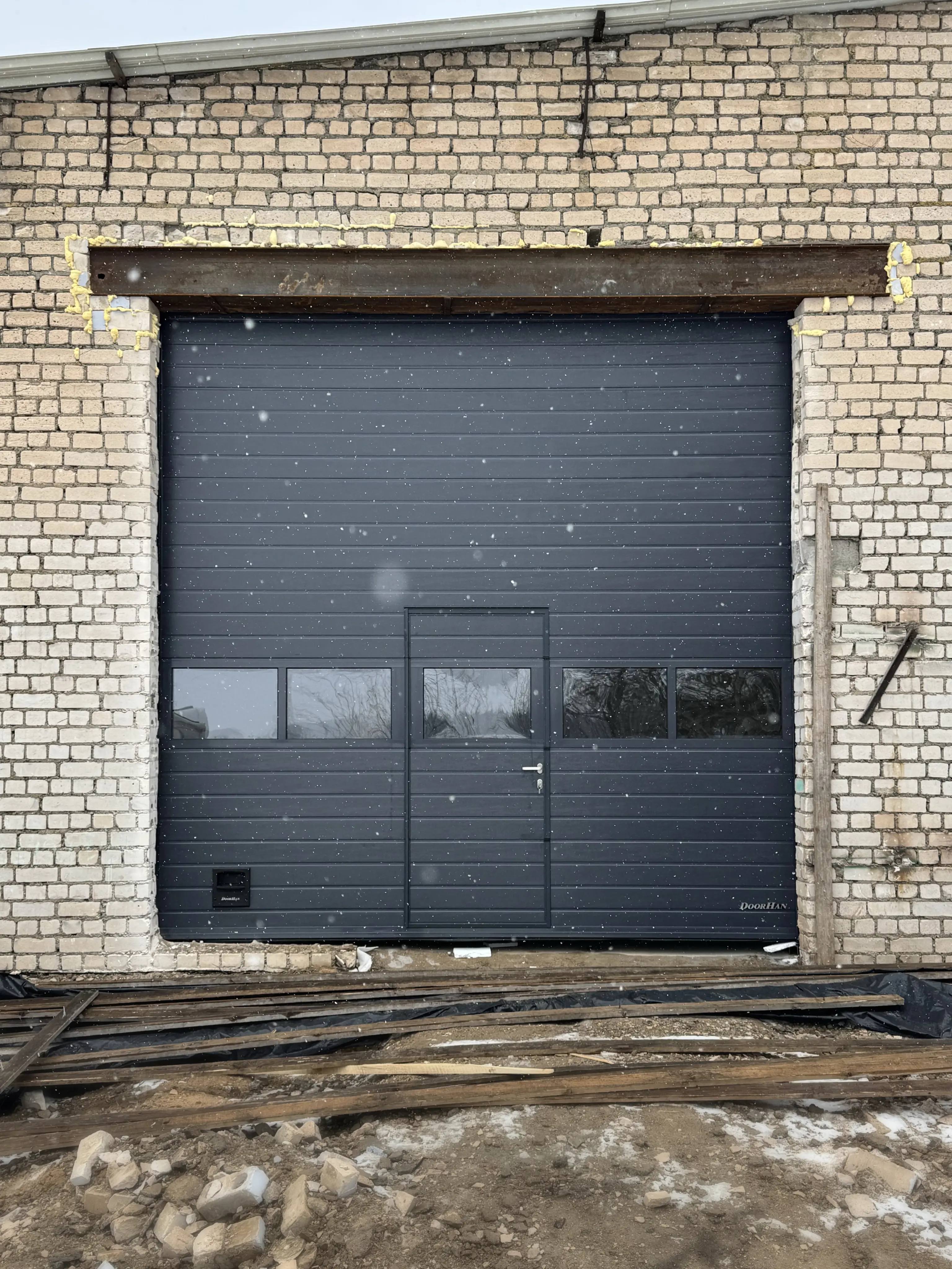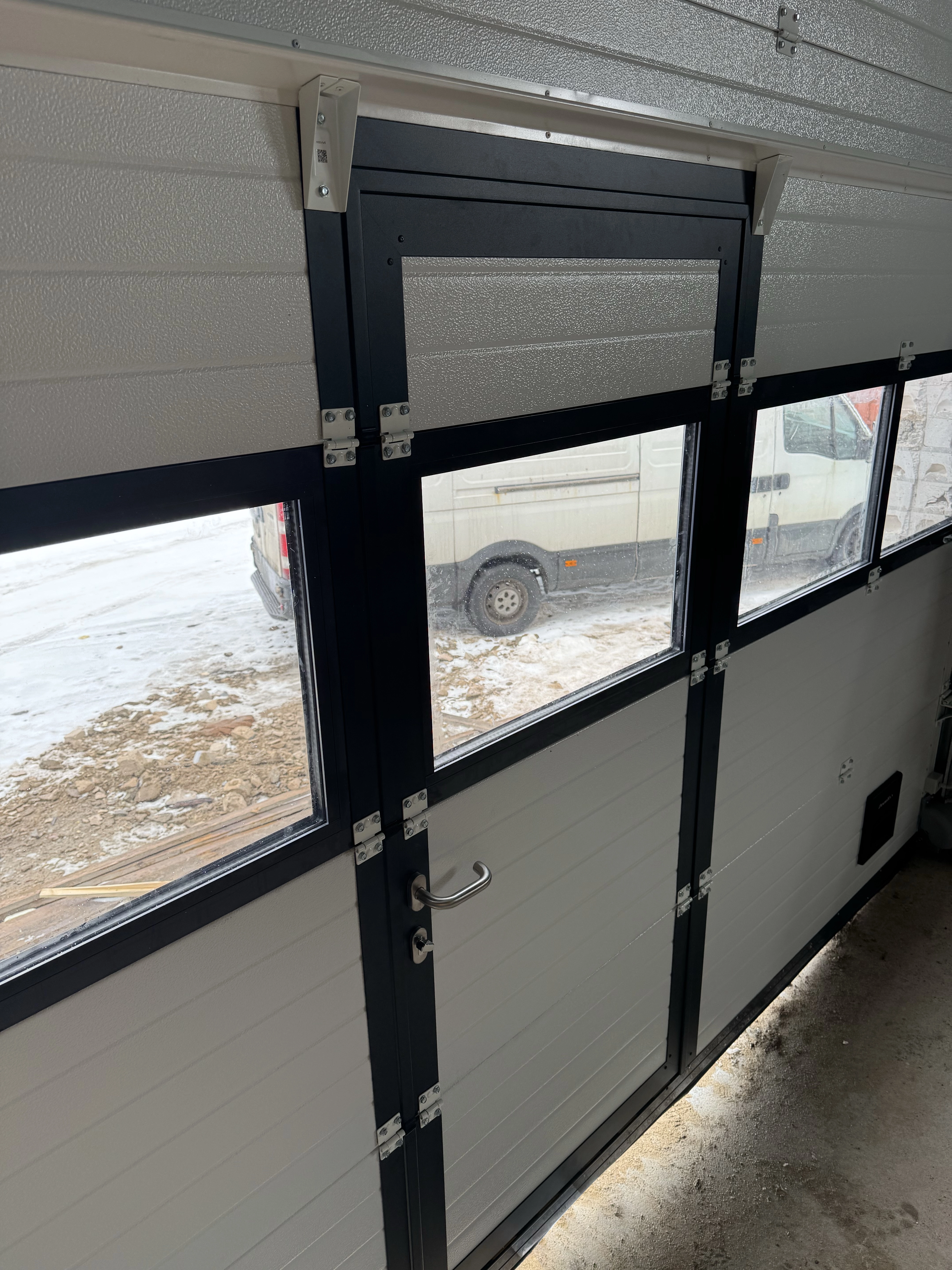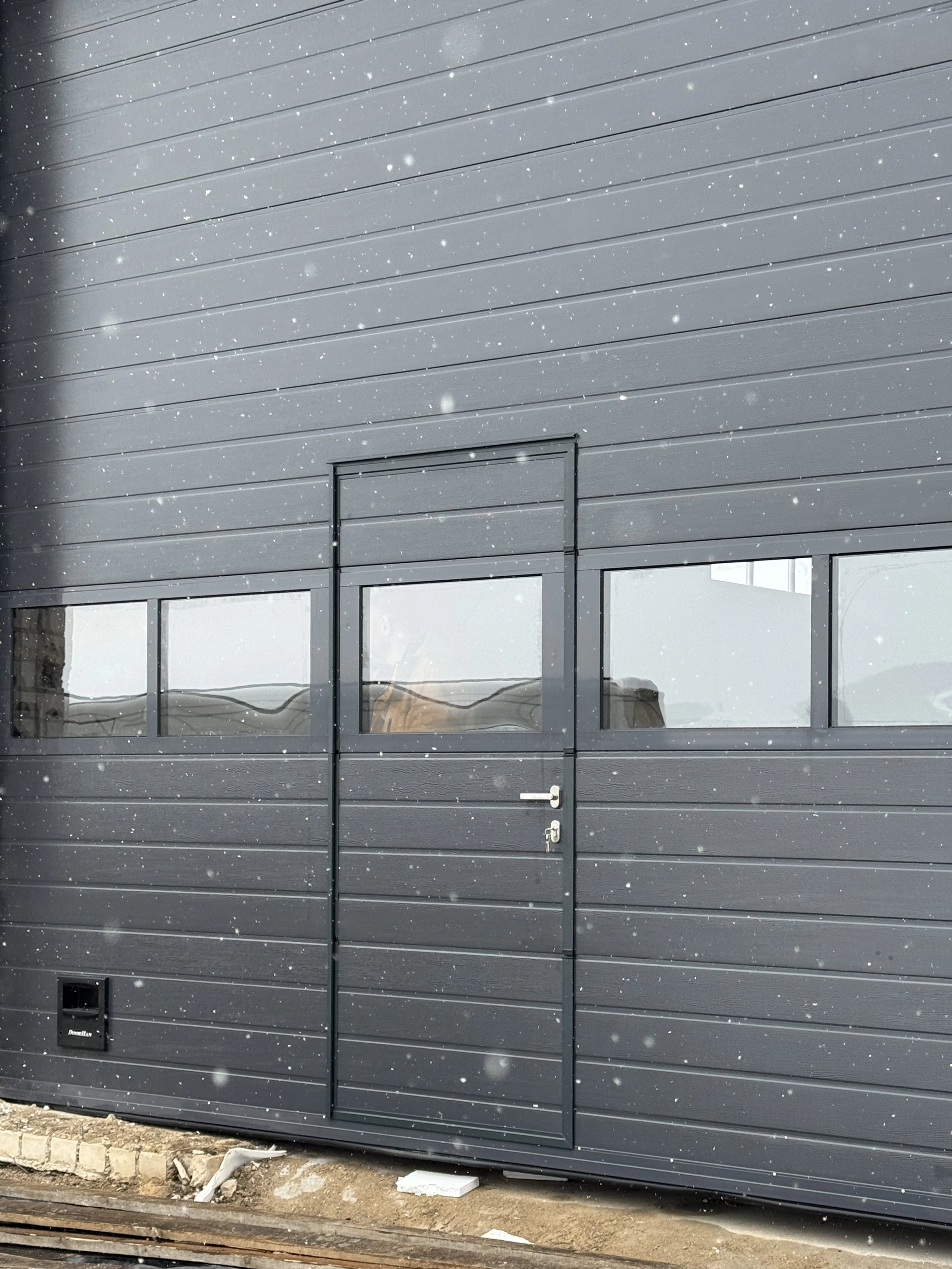 Cекционные промышленные ворота с калиткой и панорамной панелью. Оборудованы электроприводом. Цвет RAL 7024, дизайн «Доска». Профиль калитки в цвете «Графит».