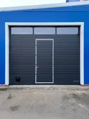 Cекционные промышленные ворота с калиткой и панорамной панелью. Оборудованы ручным цепным приводом. Цвет RAL 7016, дизайн «Доска». Профиль калитки в цвете «Металлик».